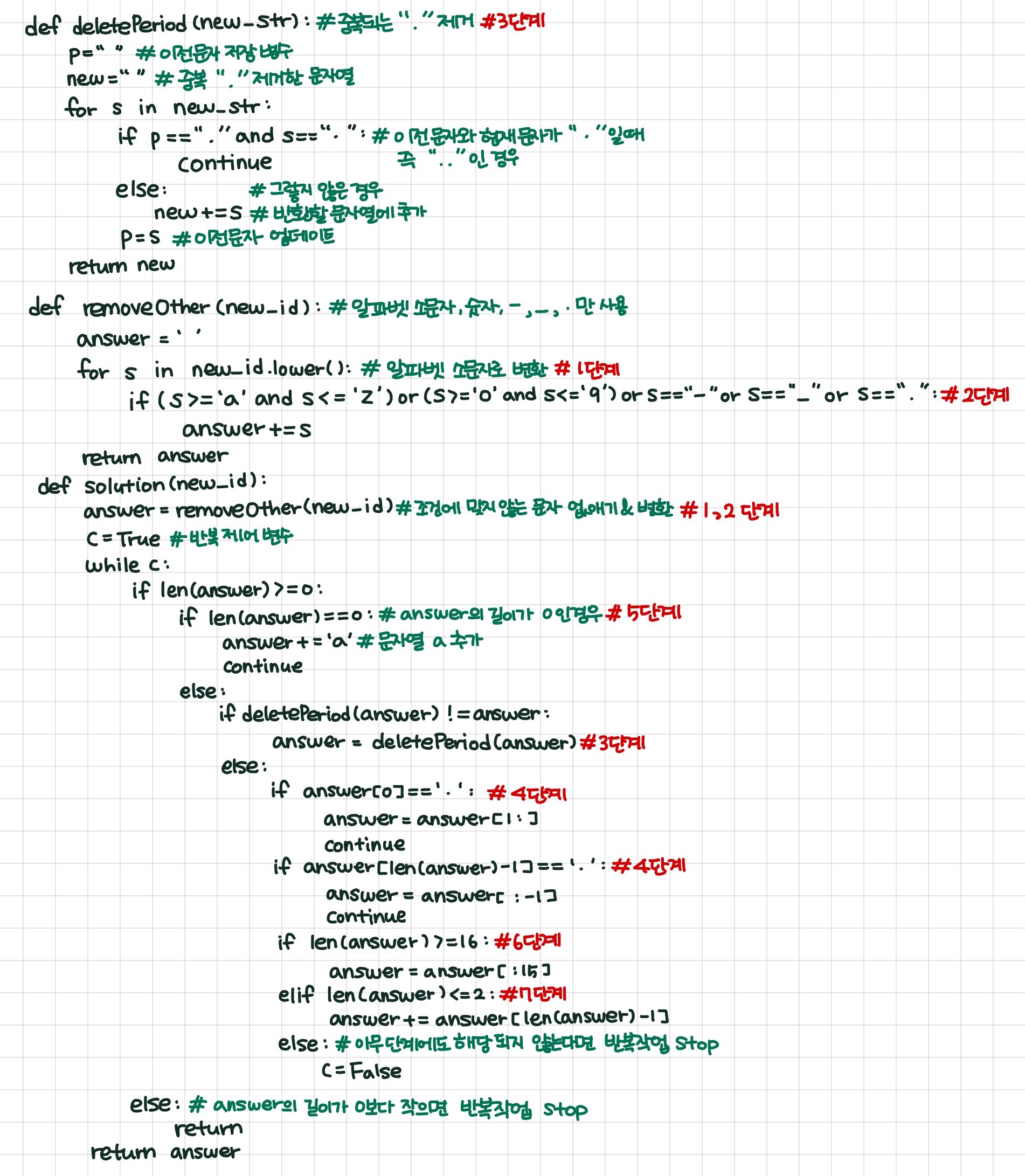 신규 유저가 입력한 아이디를 나타내는 new_id가 매개변수로 주어질 때, 네오가 설계한 7단계의 처리 과정을 거친 후의 추천 아이디를 return 하도록 solution 함수를 완성해 주세요.
