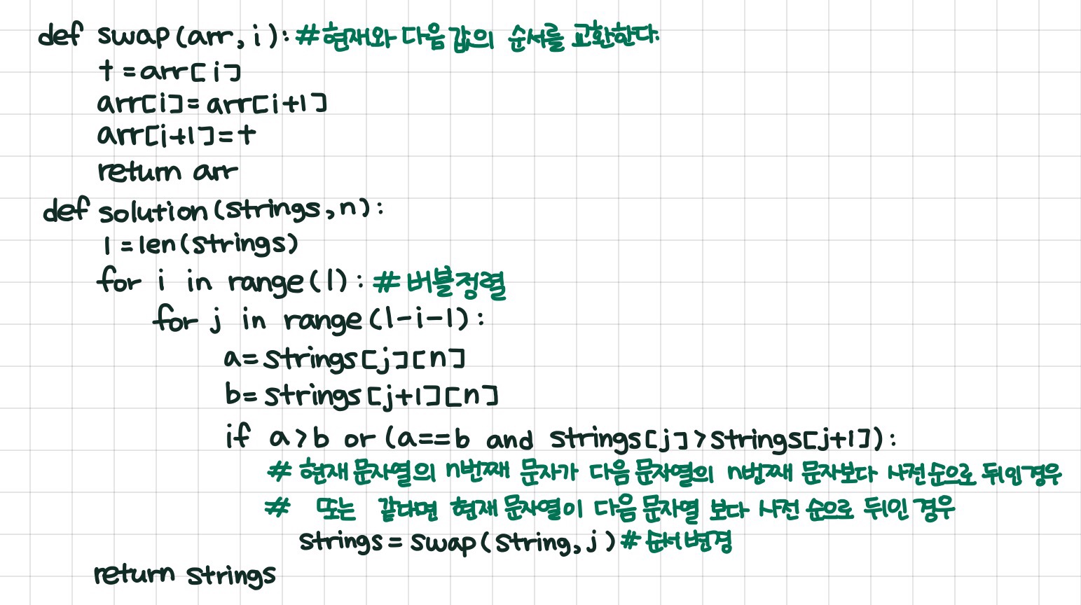 문자열로 구성된 리스트 strings와, 정수 n이 주어졌을 때, 각 문자열의 인덱스 n번째 글자를 기준으로 오름차순 정렬하려 합니다. 예를 들어 strings가 [sun, bed, car]이고 n이 1이면 각 단어의 인덱스 1의 문자 u, e, a로 strings를 정렬합니다.