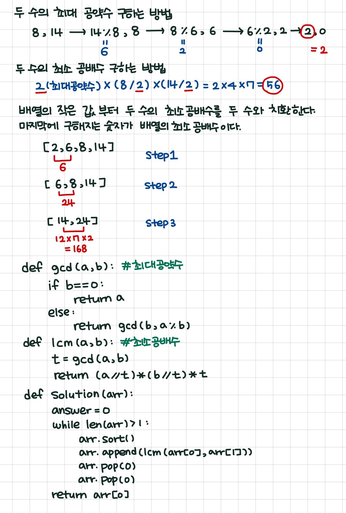 두 수의 최소공배수(Least Common Multiple)란 입력된 두 수의 배수 중 공통이 되는 가장 작은 숫자를 의미합니다. 예를 들어 2와 7의 최소공배수는 14가 됩니다. 정의를 확장해서, n개의 수의 최소공배수는 n 개의 수들의 배수 중 공통이 되는 가장 작은 숫자가 됩니다. n개의 숫자를 담은 배열 arr이 입력되었을 때 이 수들의 최소공배수를 반환하는 함수, solution을 완성해 주세요.