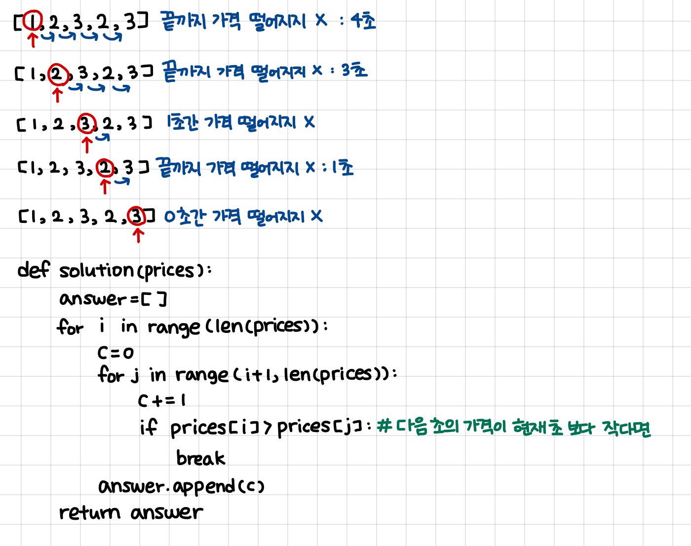 초 단위로 기록된 주식가격이 담긴 배열 prices가 매개변수로 주어질 때, 가격이 떨어지지 않은 기간은 몇 초인지를 return 하도록 solution 함수를 완성하세요.