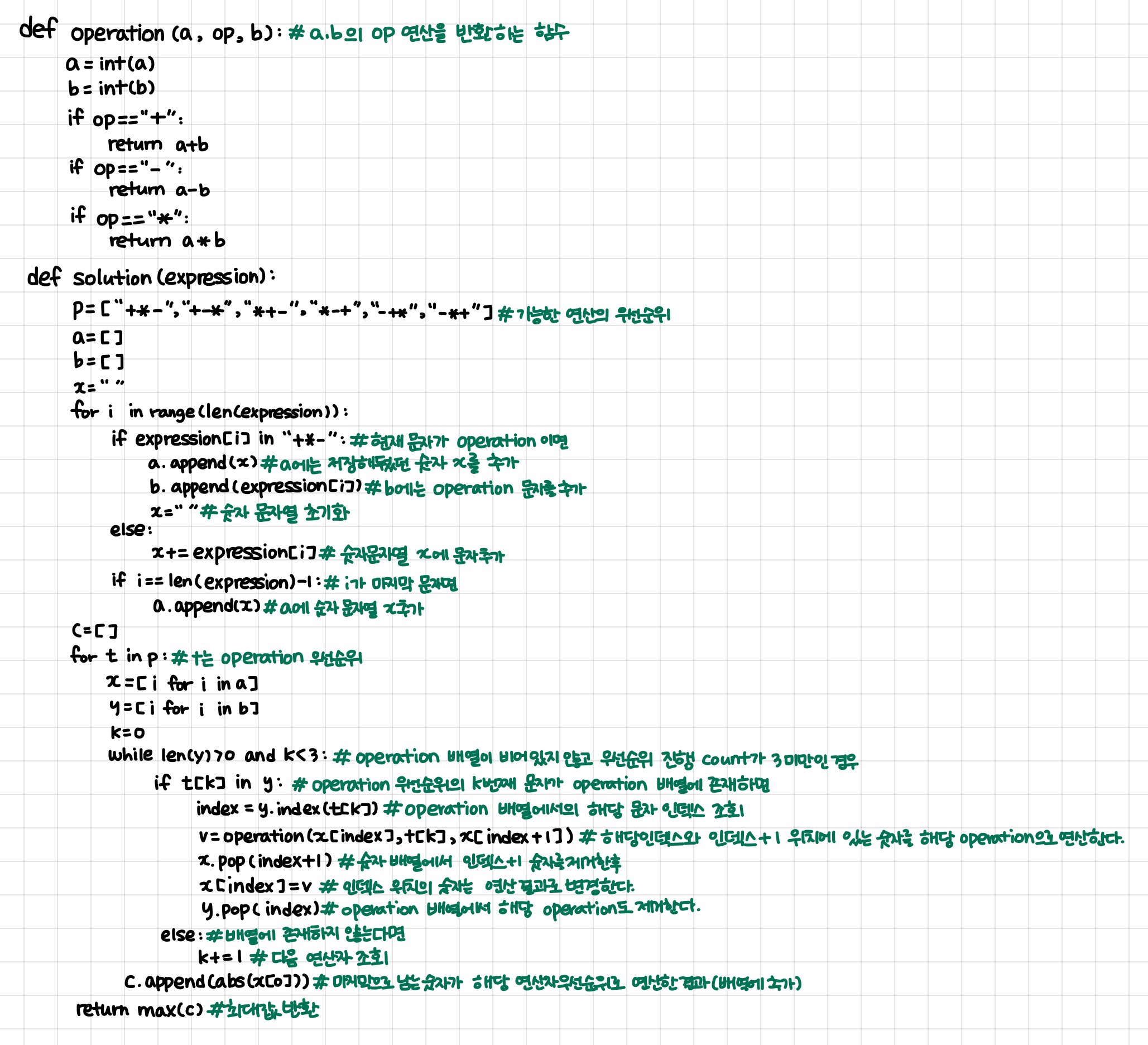 참가자에게 주어진 연산 수식이 담긴 문자열 expression이 매개변수로 주어질 때, 우승 시 받을 수 있는 가장 큰 상금 금액을 return 하도록 solution 함수를 완성해주세요.