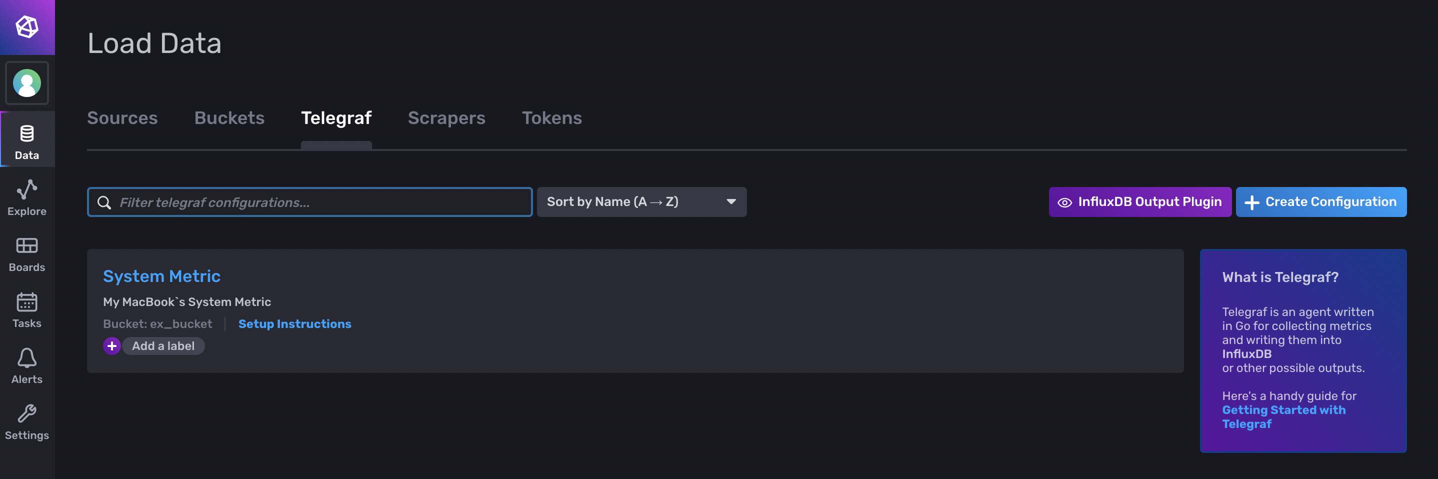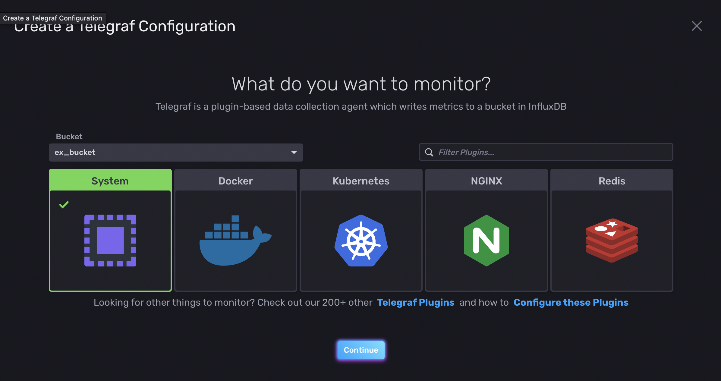 좌측의 Data>Telegraf>Create Configuration에서 System을 선택한 후 name을 지정해준다.