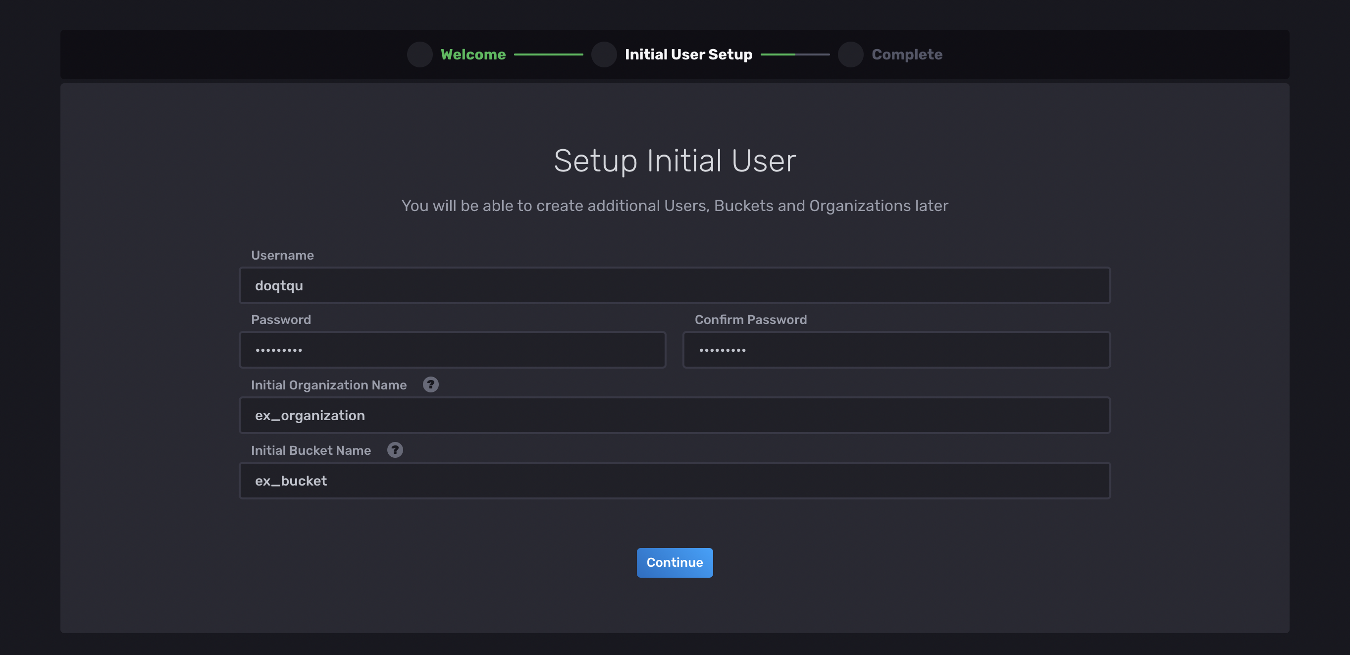 get start를 클릭하여 username, password, organization name, bucket name 등을 설정해준다.