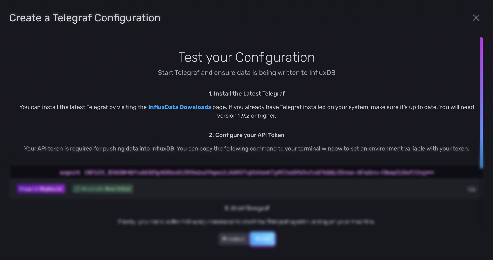 2. Configure your API Token에 export INFLUX_TOKEN= 이후로 나오는 문자가 API Token으로 telegraf config에서 해당 토큰을 붙여넣어줘야하기 때문에 복사해놓는다.