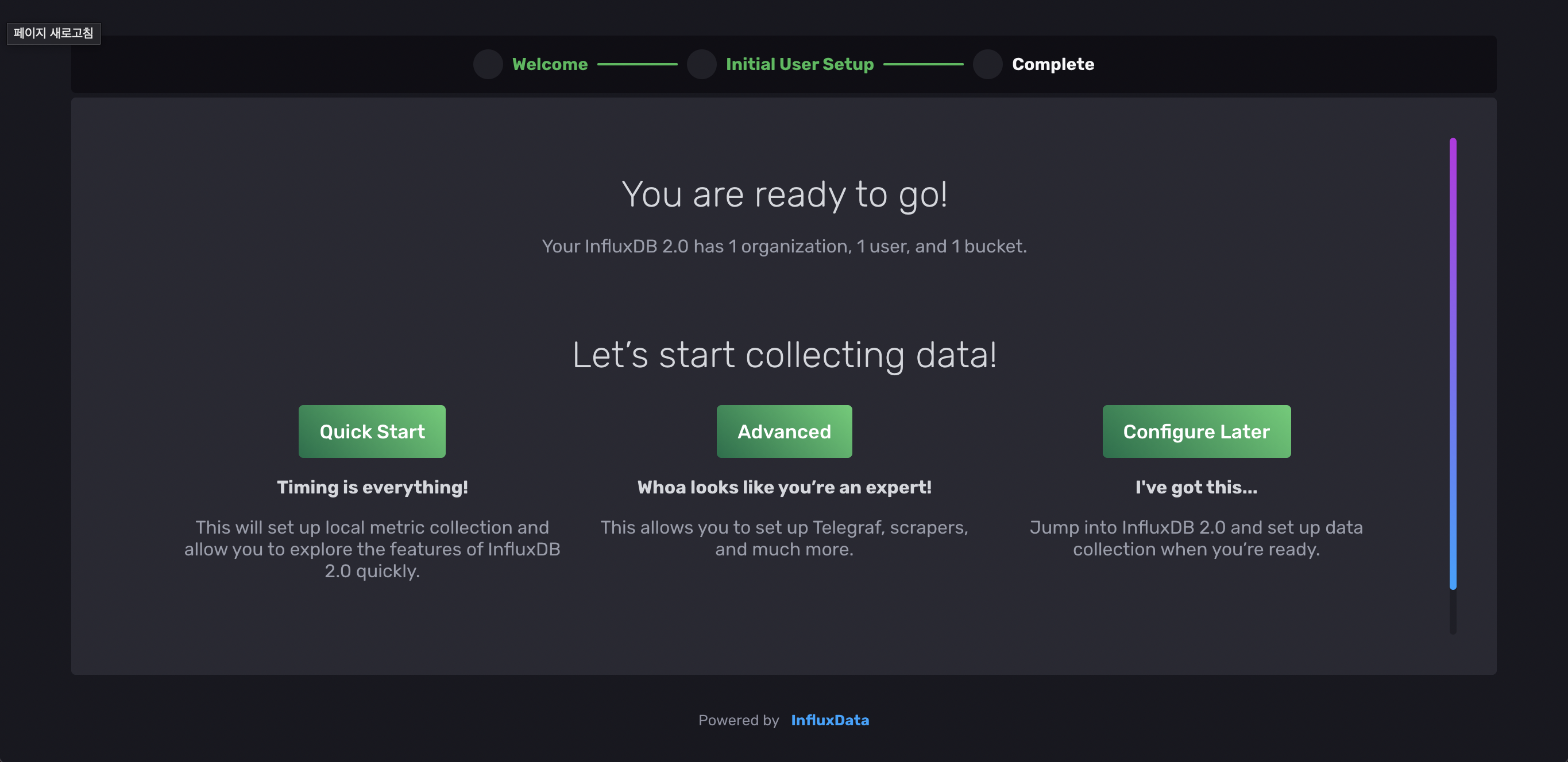 설정이 완료되면, Quick Start를 이용해 telegraf 연결을 위한 설정을 진행한다.