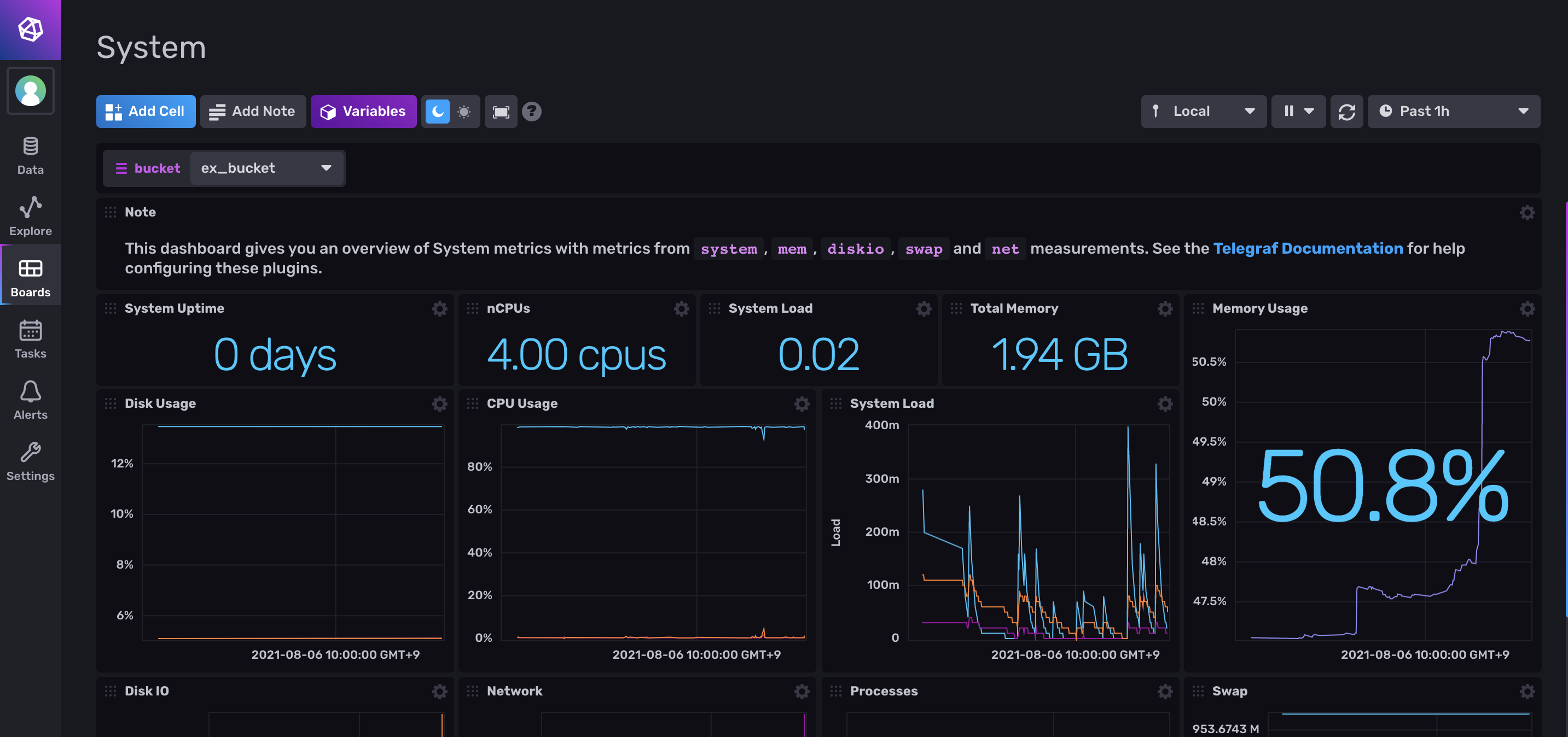 해당 Board에 들어가면 Telegraf를 통해 수신한 데이터가 표시된다.