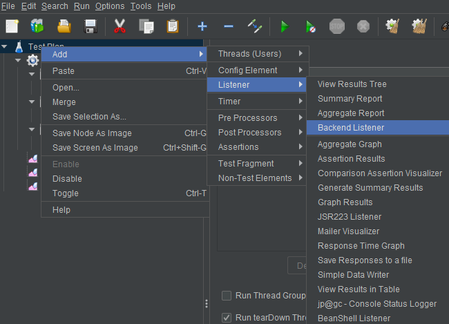 Test plan에 Add-> Listener -> Backend Listener를 추가한다.