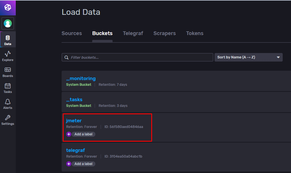 JMeter Data를 담을 Bucket 생성(예시에서는 jmeter라는 이름의 Bucket을 생성)