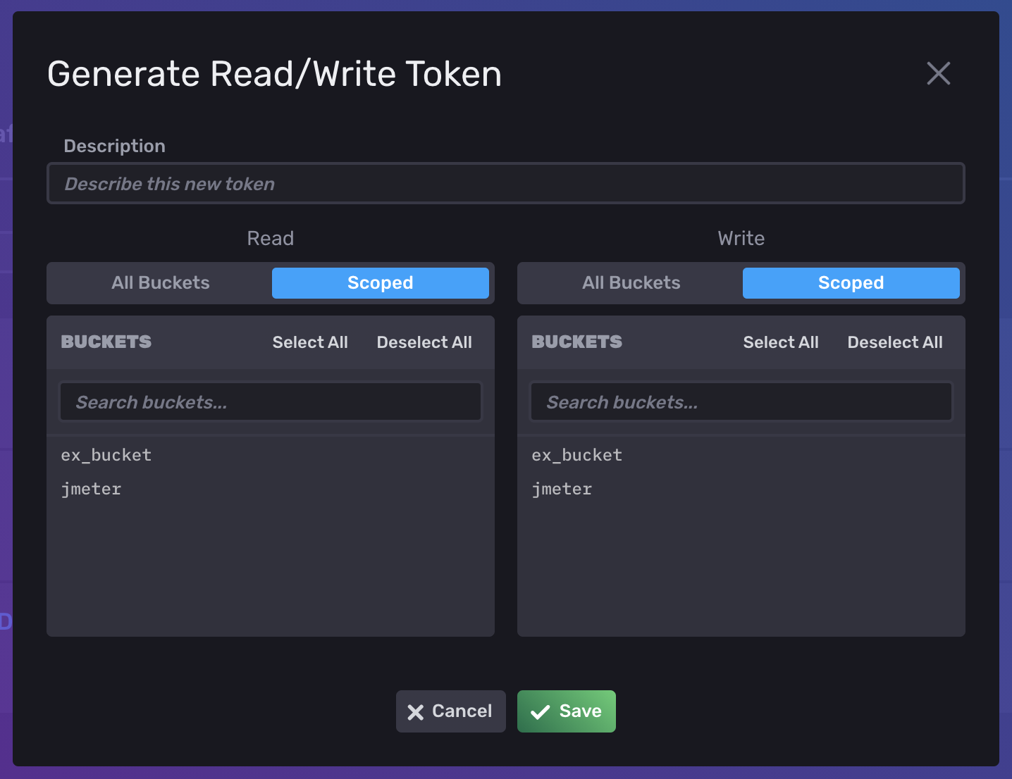 위에서 생성한 Bucket에 읽기/쓰기 권한을 부여한 Token을 생성한다.