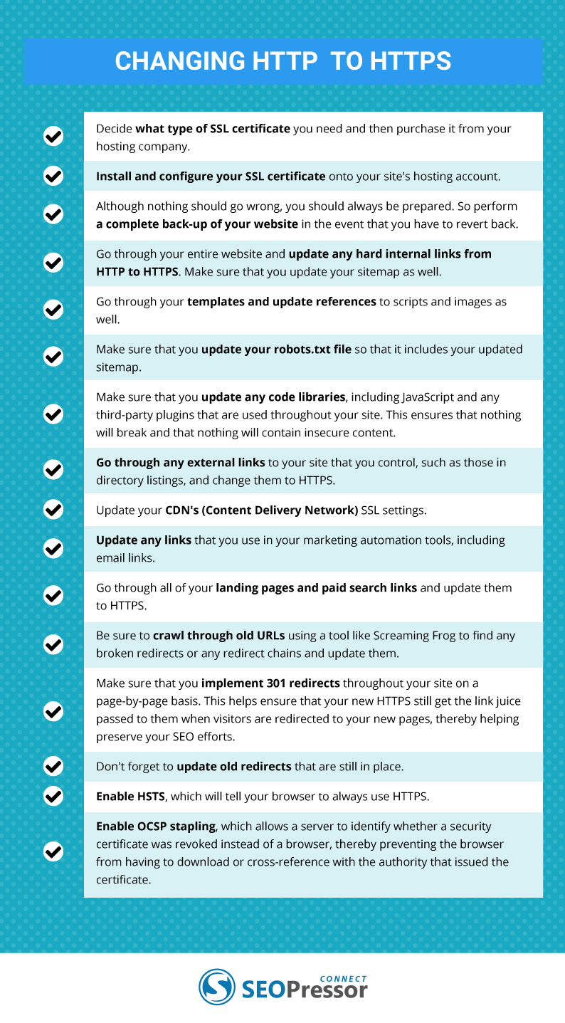 HTTP에서 HTTPS로 전환하면 많은 이점이 있지만 여전히 몇 가지 전환할 때 발생할 수 있는 잠재적인 문제가 있다. 다음은 잠재적인 SEO 관련 문제를 방지하기 위해 HTTPS로 전환할 때 명심해야하는 몇 가지 사항이다.