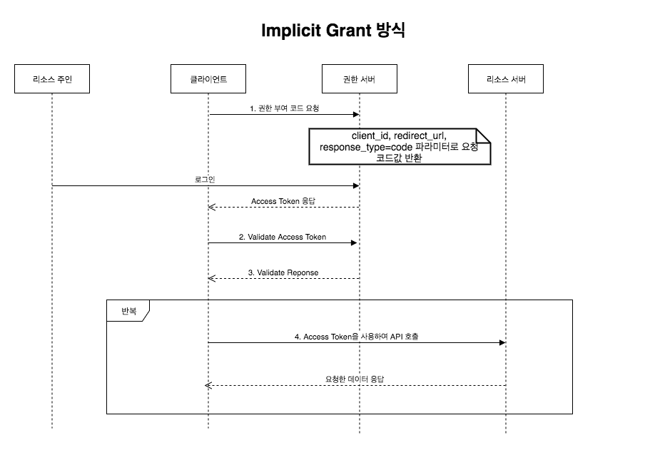 | Implicit Grant | - Authorization Code Grant과 다르게 권한 코드 교환 단계가 없음 - 액세스 토큰을 즉시 반환받아 이를 인증에 이용하는 방식 |
