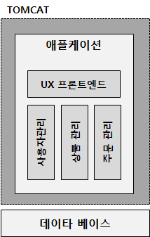 예를 들어, 온라인 쇼핑몰 애플리케이션이 있을 때, 톰캣 서버에서 도는 WAR 파일(웹 애플리케이션 패키징 파일)내에, 사용자 관리, 상품 관리, 주문 관리 등 모든 컴포넌트들이 들어있고 이를 처리하는 UX로직까지 하나로 포장되어 들어가있는 구조이다.
