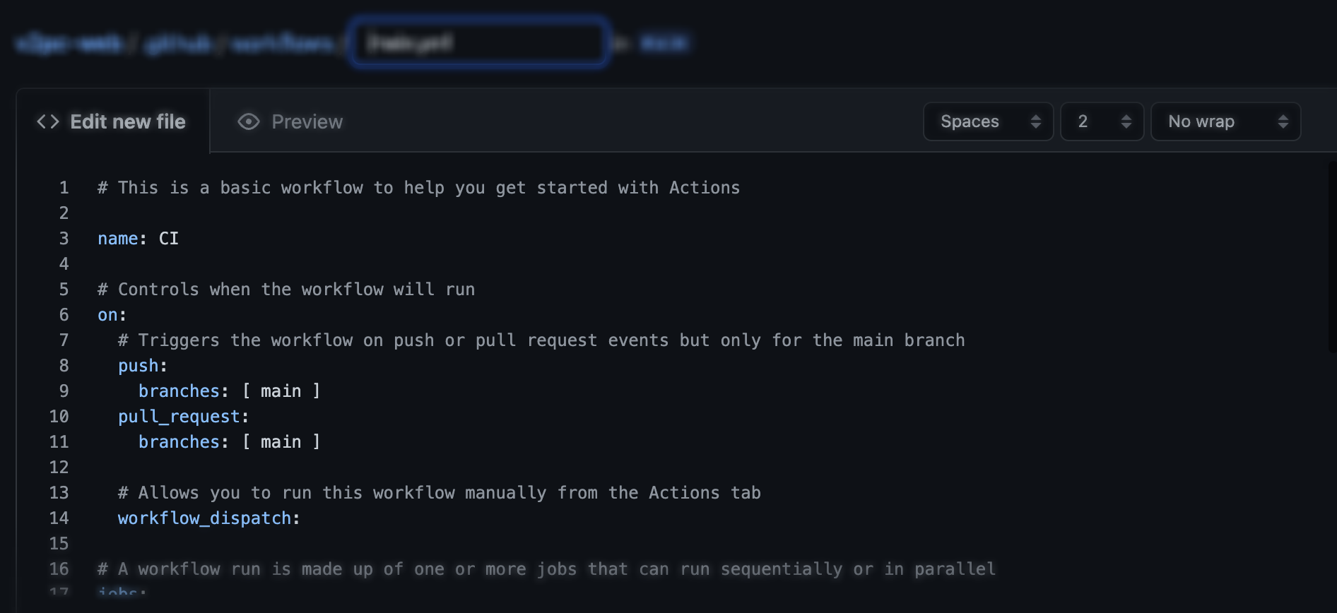 repository에 들어가보면 Actions에서 [new work flow]>[set up a workflow yourself]로 만들 수도 있다.