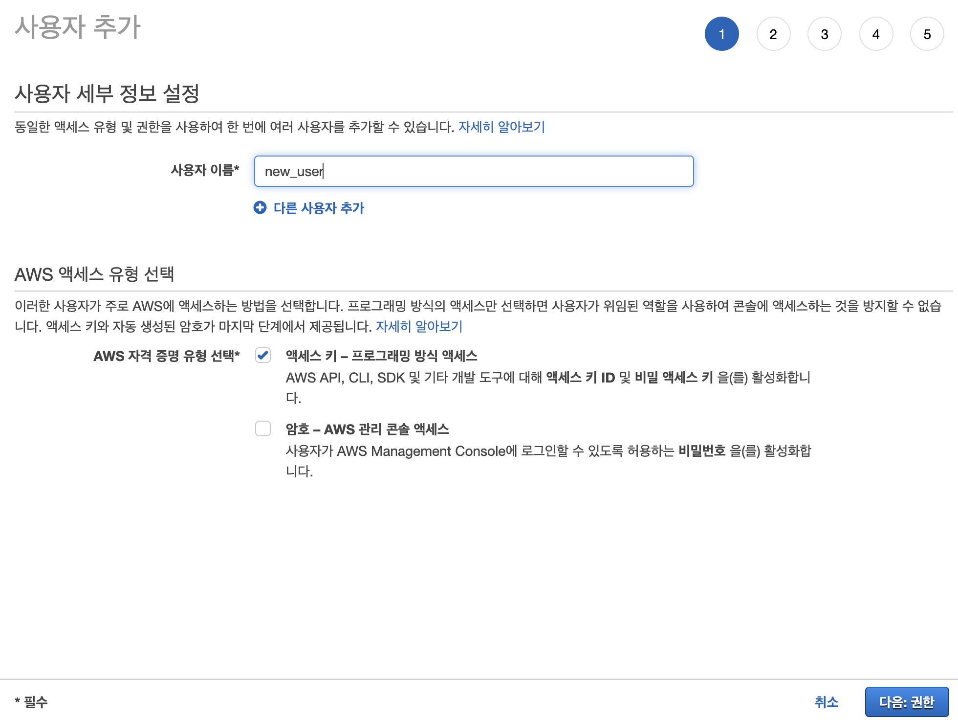 우선 AWS IAM에서 사용자 추가를 눌러 임의의 이름을 설정한 후 아래와 같이 AWS 자격 증명 유형으로 액세스 키-프로그래밍 방식 액세스를 선택한다.