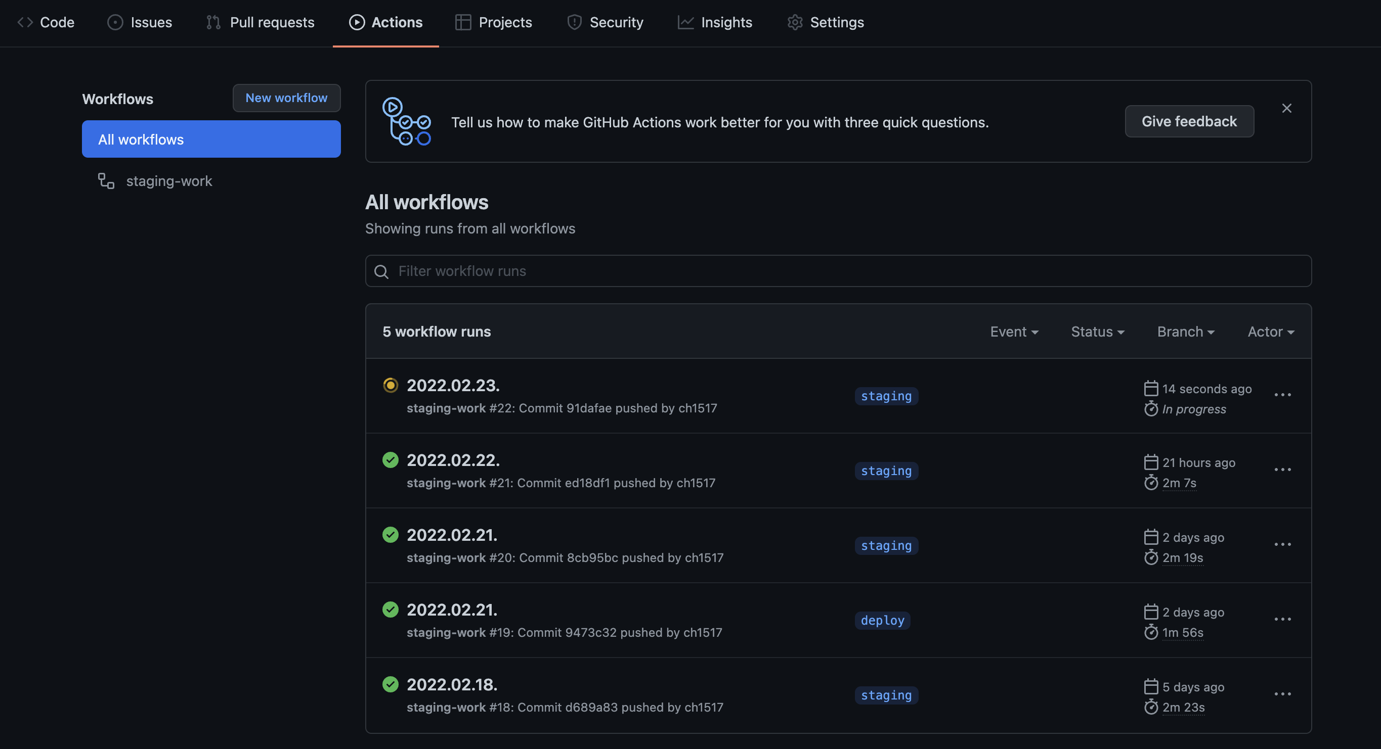 이외에도, Action 이름, Action이 수행된 branch name, commit summary, 걸린 시간 등과 같은 정보를 확인할 수 있다.