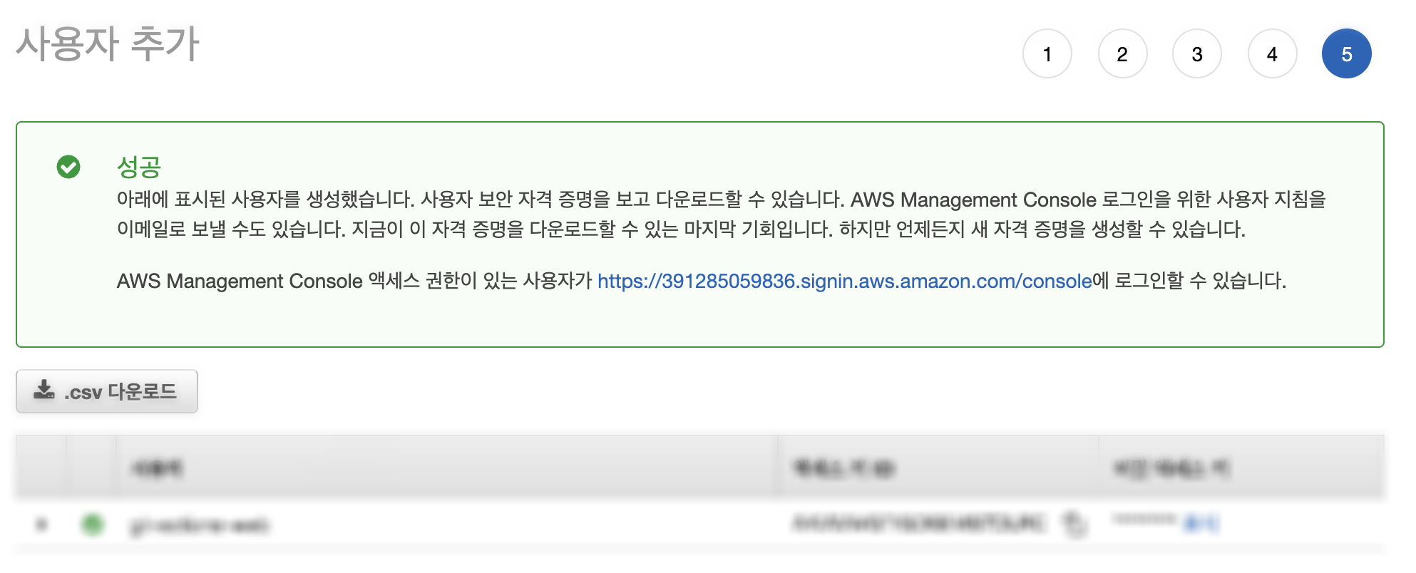 검토를 거쳐 사용자 만들기를 누르면 아래와 같이 Access Key ID와 Secret Access 정보를 .csv 파일로 다운 받을 수 있다.