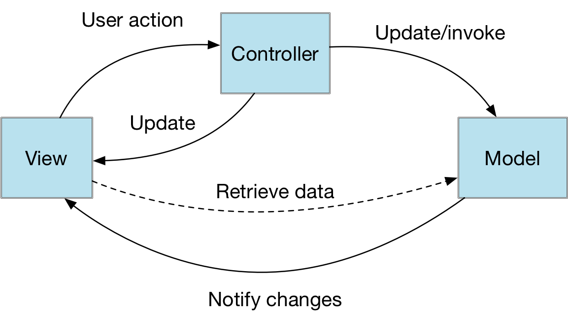 There is a prolific list of architectural patterns that have been proposed for GUI-based apps that operate in a multi-tier mode. The root of the mess is the classic MVC that suggests to separate apps' code in three different layers: Model, View, and Contro
