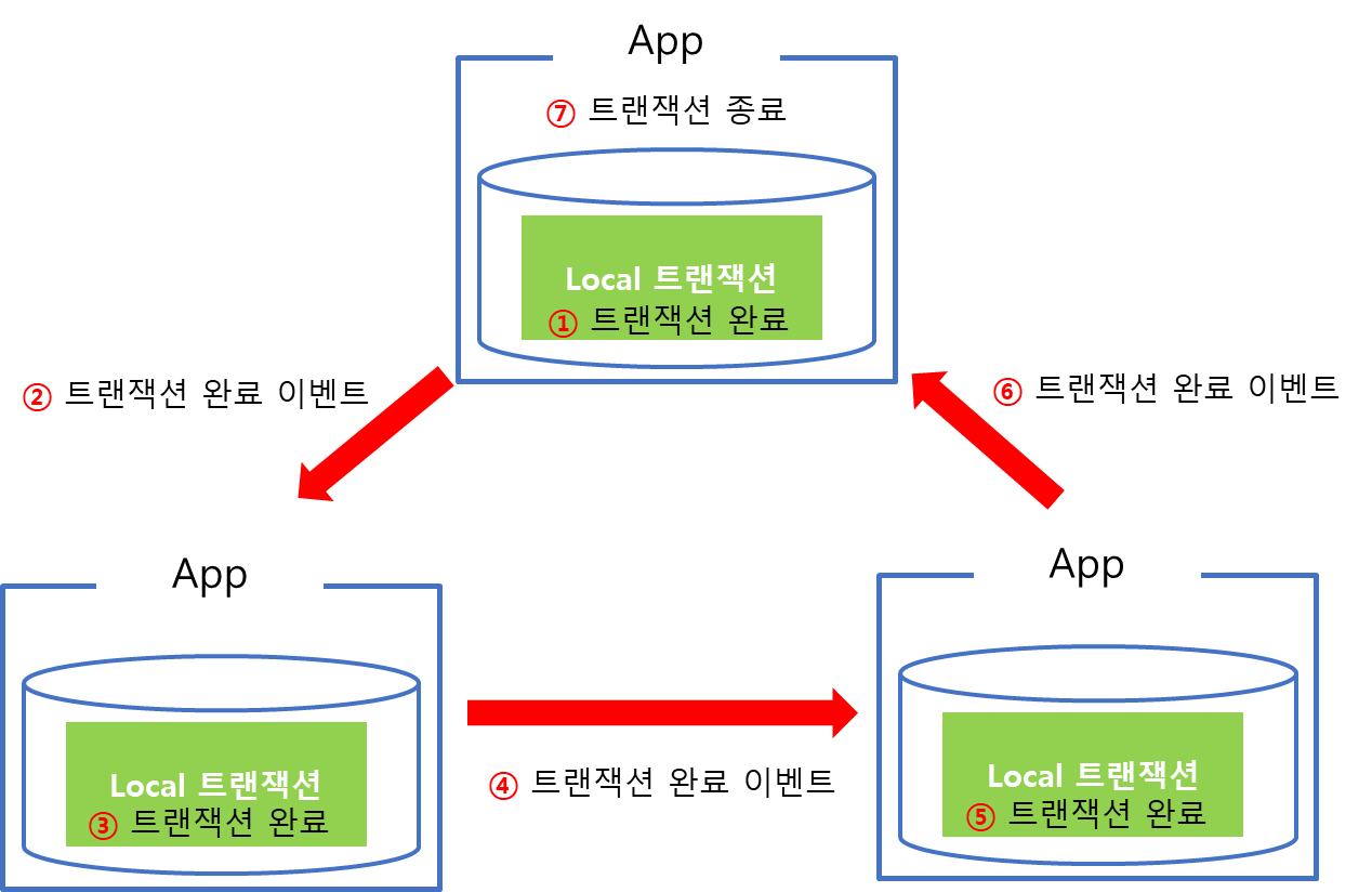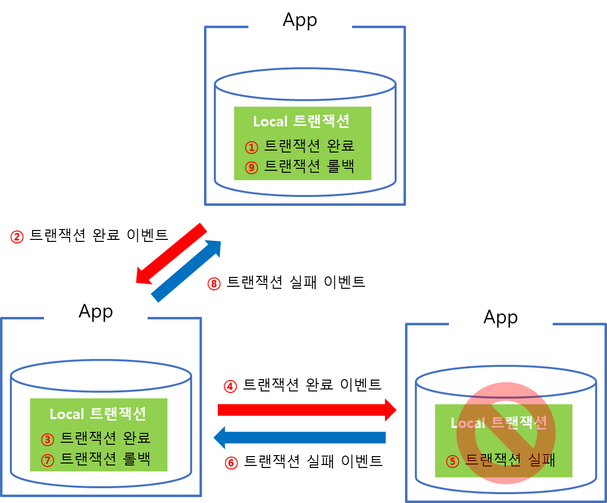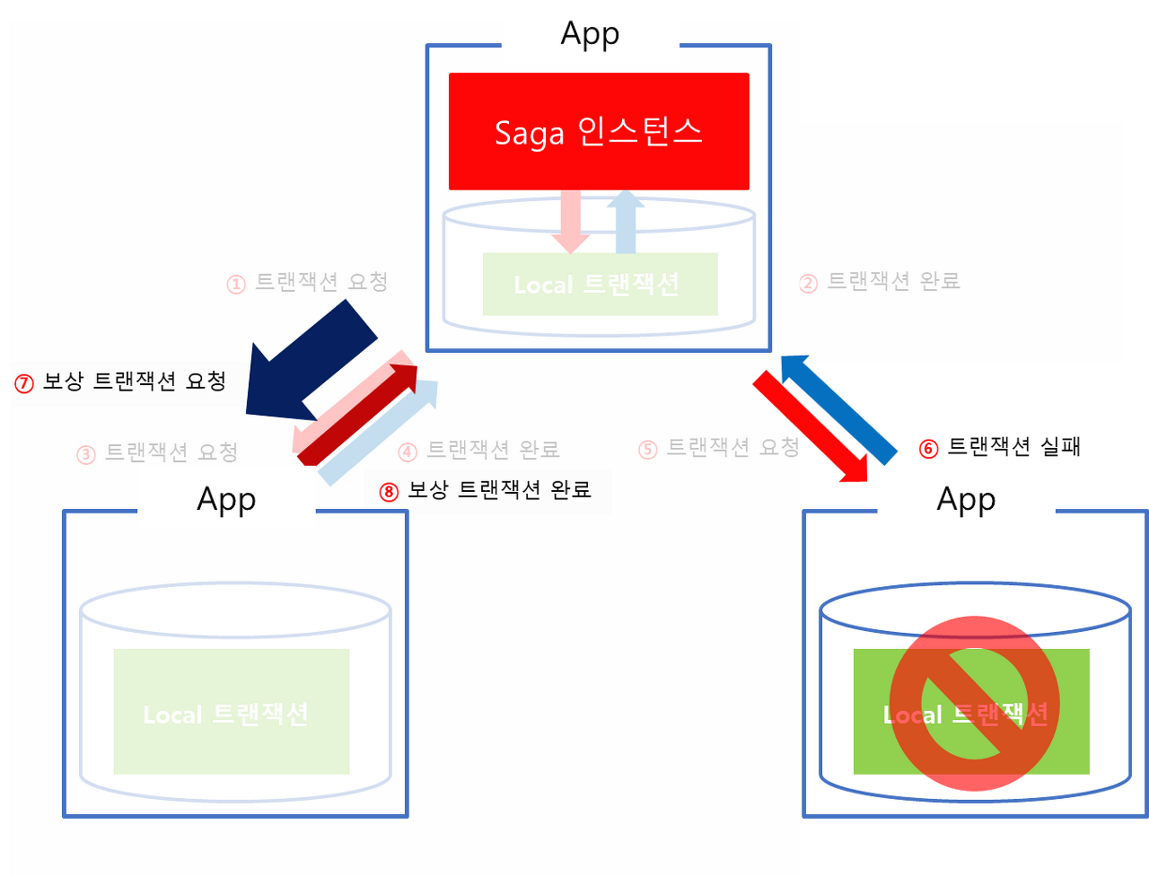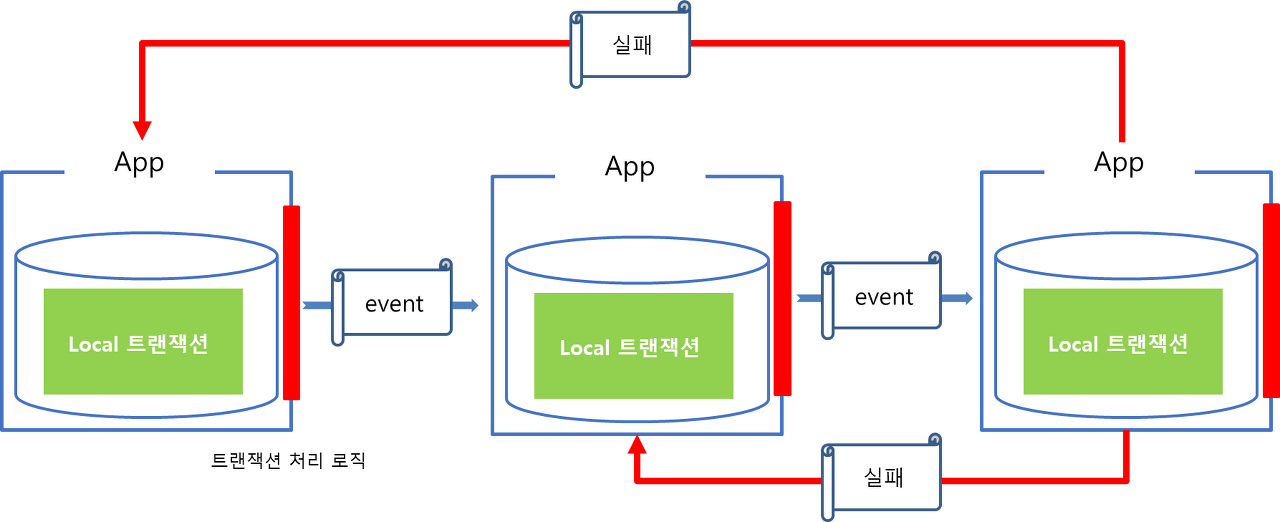 따라서 각각의 App에 대한 연속적인 트랜잭션 요청 및 실패의 경우에 Rollback 처리(보상 트랜잭션)을 Application에서 구현해야 한다.
