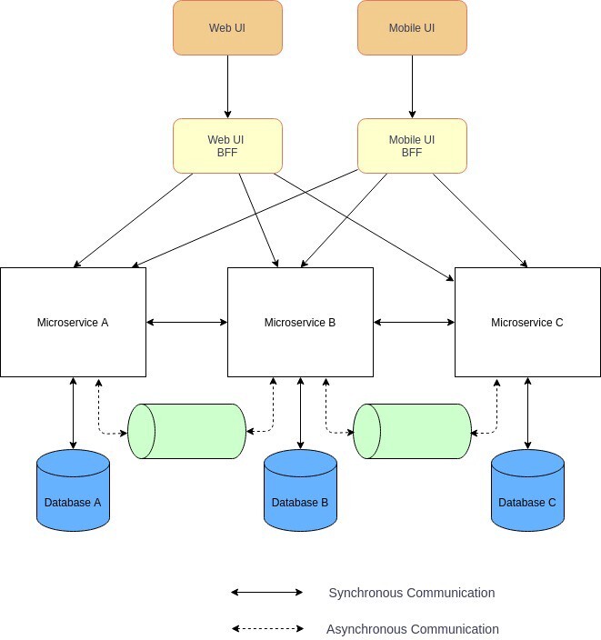 최신 비즈니스 애플리케이션 개발, 특히 마이크로 서비스 아키텍처에서 프론트엔드 및 백엔드 애플리케이션은 분리되어 별도의 서비스로 동작하며 API 또는 GraphQL을 통해 연결된다. 애플리케이션에 모바일 앱 클라이언트도 있는 경우 웹 및 모바일 클라이언트 모두에 동일한 백엔드 마이크로 서비스를 사용하는 것은 문제가 된다. 모바일 클라이언트의 API 요구 사항은 화면 크기, 디스플레이, 성능, 에너지 소스 및 네트워크 대역폭이 다르기 때문에 일반적으로 웹 클라이언트와 다르다.