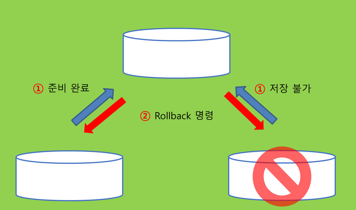 모든 DB에서 트랜잭션 처리가 완료되면 전체 트랜잭션을 종료한다. 만약 두 단계를 거치는 과정에서 연관된 DB 중 하나의 DB라도 Commit을 할 수 없는 상황이라면, 모든 DB에게 Rollback을 요구한다. 트랜잭션을 종료하는 동시에 모든 DB 데이터가 영속화된다. 따라서 트랜잭션의 범위는 데이터를 처리하는 DB 전체이다.