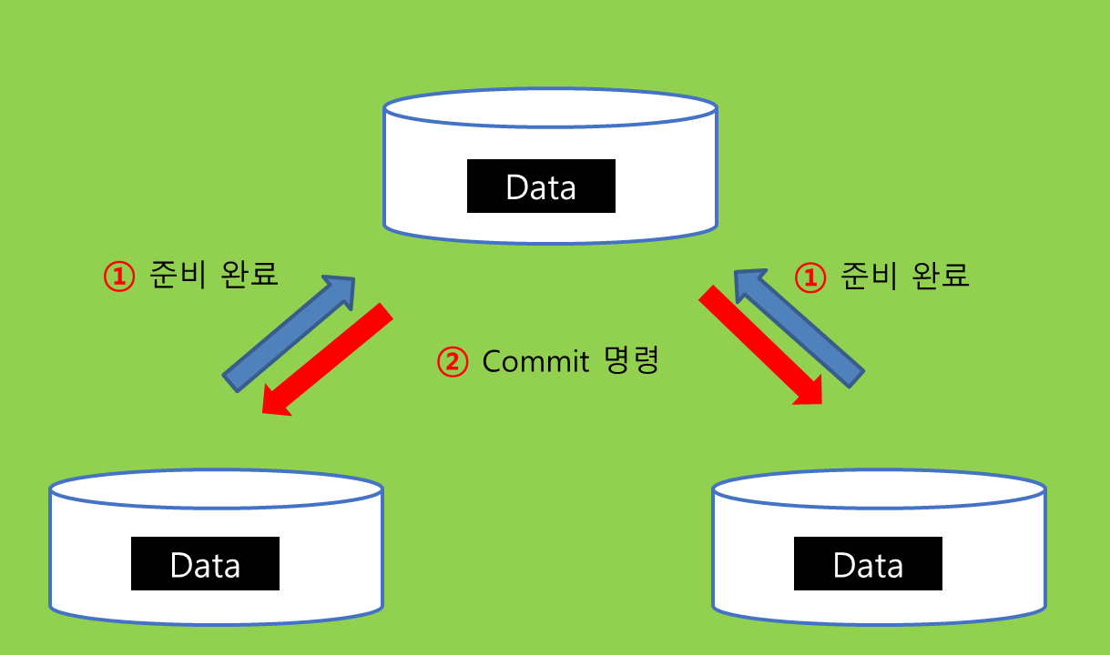 조정자는 첫 번째 단계에서 전달한 메시지에 대한 응답을 기다린다. 모든 메시지 수신이 완료되면 두 번째 단계인 Commit을 진행한다. Commit 단계에서는 조정자가 연관된 DB에게 데이터를 저장하라는 메시지를 송신하며, 수신받은 DB에서는 각자 DB에 데이터를 영속화한다.