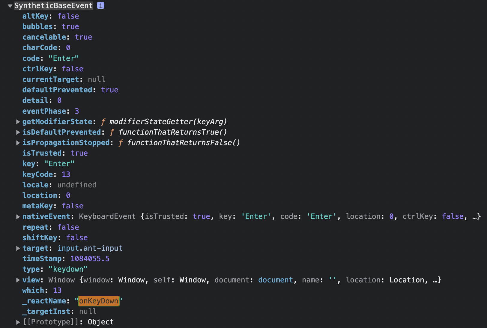 하지만, Ant Design의 onPressEnter는 엔터값을 입력받는지 체크하는 함수임으로, 합성이벤트(SyntheticEvent)로 onKeyDown을 사용하고 있다.
