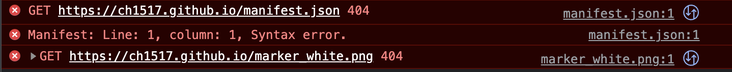 GitHub Pages로 배포 시 PUBLIC_URL은 'https://[user_name].github.io'가 되기 때문에 아래와 같이 경로를 찾지 못하는 문제가 발생한다.