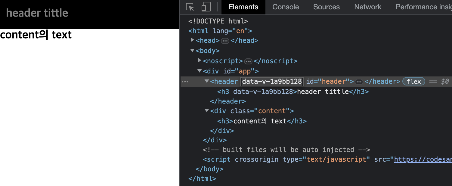 scoped style은 다음과 같이 data-v-[hash]와 같은 scoped 속성이 추가된다.