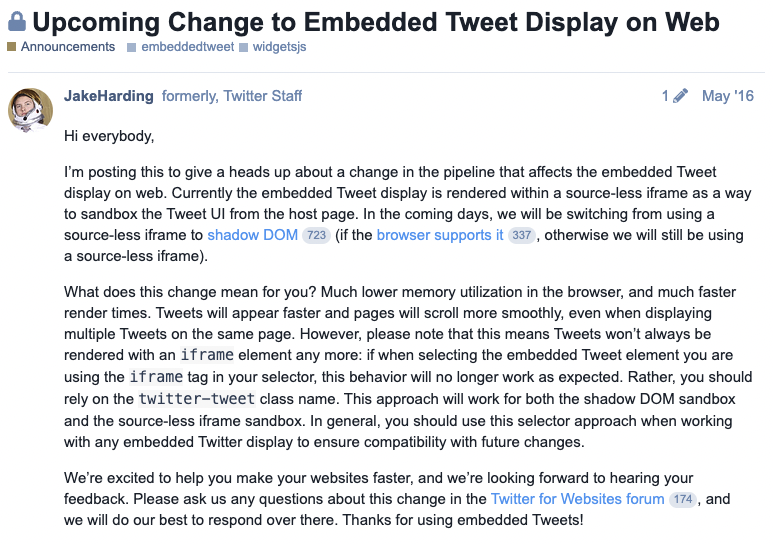 2016년도에 트위터는 위와 같은 이유로, iframe으로 지원하던 기능을 Shadow DOM 방식으로 전환했다. (지원하지 않는 브라우저는 기존과 동일하게 iframe으로 지원)