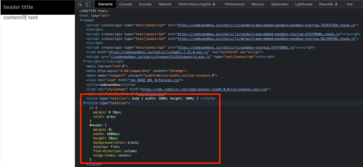 아래는 예시코드로, #header의 h3을 Shadow DOM으로 생성해서 style을 적용했다.