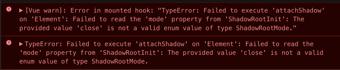 'closed'에서 attachShadow로 element로 접근을 시도할 때는 아래와 같은 오류가 발생한다.