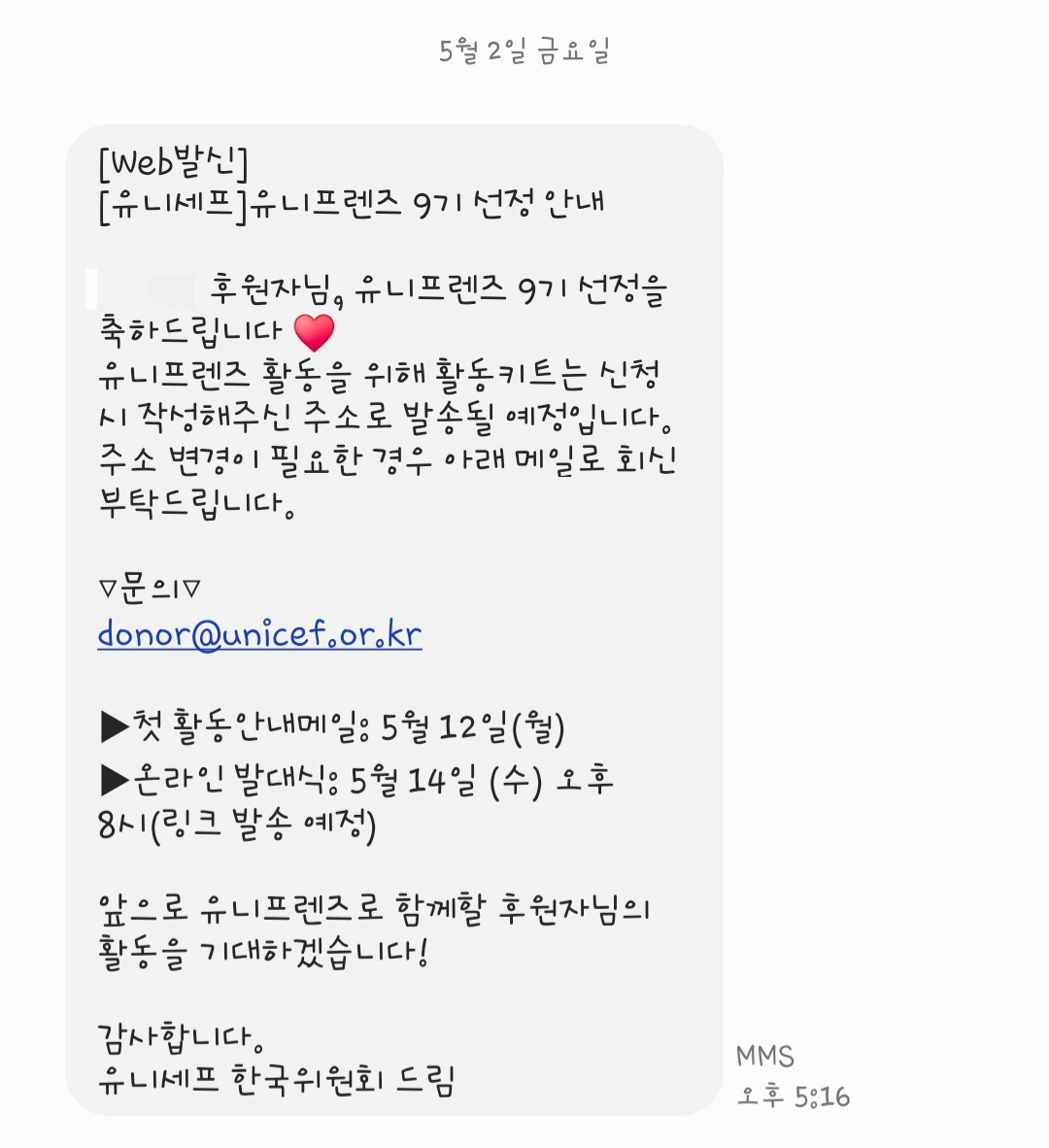 4월 초에 담당하던 서비스 개편이 마무리되면서 일에 조금 여유가 생겼다. 그러던 중 유니프렌즈 9기 홍보 문자를 받았고, 시간적 여유가 생긴 김에 봉사활동도 참여해보자는 생각으로 지원하게 되었다. 5월 초에 유니프렌즈 선정 안내 메세지를 받았는데, 지금 회사에 입사한 후에 어딘가 지원하고 합/불합을 받아보는게 너무 오랜만이라 그런지 기분이 좋았다. ㅎㅎ