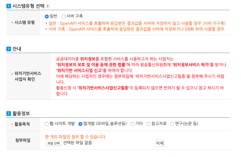 2. 활용신청버튼을 누르고 다음과 같은 화면으로 이동한다.
