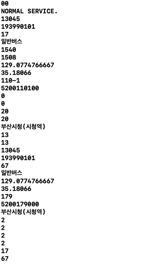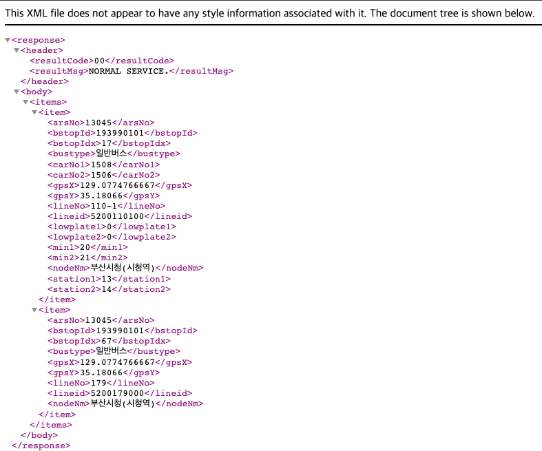 ServiceKey에는 1-3의 키 값을 붙여넣기하고 미리보기를 누르면 다음과 같은 xml화면이 나타난다.