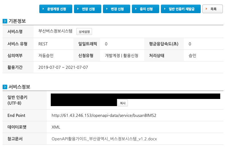 3. [마이페이지]>[오픈API]>[개발계정 상세보기]에서 승인이 완료됐는지를 확인한다.