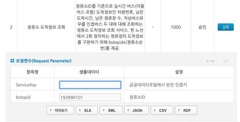 4. 오픈API를 사용할 수 있는지를 상세 기능정보 표의 오른쪽 실행 버튼을 이용해 알아본다.