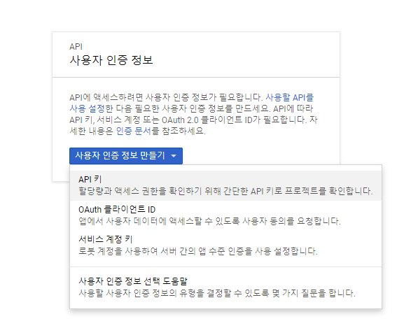 사용자 인증 정보 만들기에서 API 키를 선택합니다.