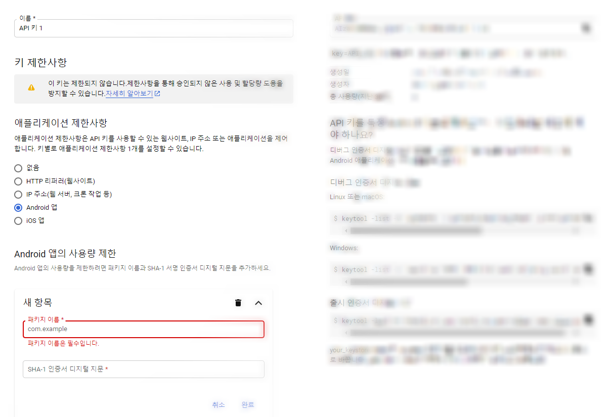 키 이름 변경은 자유, 애플리케이션 제한사항은 Anroid 앱 선택
