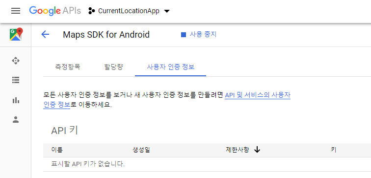 팝업창이 뜨면, 키 제한 생성 or API 키 우측의 연필 모양 아이콘을 눌러 API 키 제한을 수정합니다.