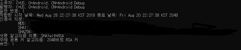 window의 경우 cmd(명령프롬프트)창에서 다음과 같은 명령어로 SHA-1 인증서 디지털 지문을 확인 할 수 있다.